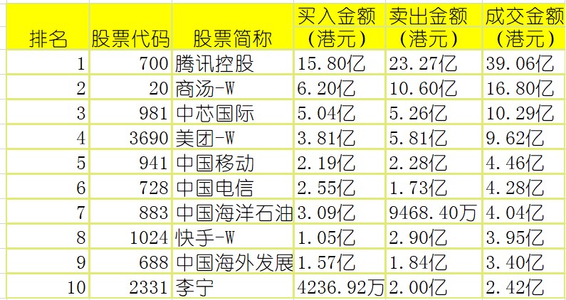 港股通(沪)买卖前十股(单位:港元):