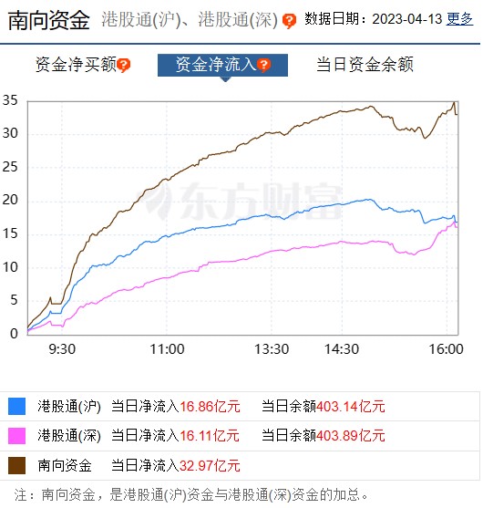 截至4月13日港股收盘,南向资金全日合计净流入逾32.97亿港元。其中,沪市港股通净流入16.86亿港元,深市港股通净流入16.11亿港元。