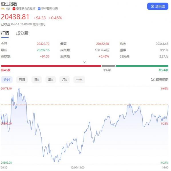 香港恒生指数开盘涨0.38%。全天呈窄幅震荡态势。截至收盘,恒生指数涨0.46%或94.33点,报20438.81点,全日成交额1083.64亿港元;恒生国企指数涨0.57%,报6914.4点;恒生科技指数涨0.1%,报4164.03点。