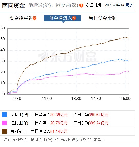 截至4月14日港股收盘,南向资金全日合计净流入逾30.38亿港元。其中,沪市港股通净流入20.46亿港元,深市港股通净流入16.11亿港元。