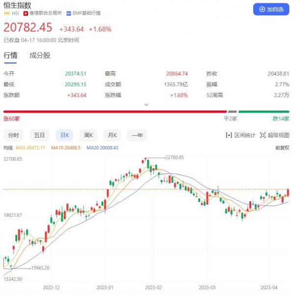 香港恒生指数开盘跌0.31%。早盘低开后快速拉升,回落后温和上扬。午后呈单边上行趋势,盘中一度涨超2%,尾盘涨幅则略有收窄。截至收盘,恒生指数涨1.68%或343.64点,报20782.45点,全日成交额1365.79亿港元;恒生国企指数涨2.05%,报7056.16点;恒生科技指数涨2.16%,报4254.01点。