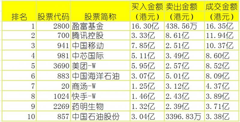 港股通(沪)买卖前十股(单位:港元):
