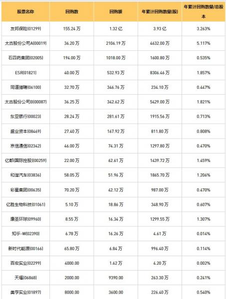 和谐汽车(03836)、彩星集团(00635)、亿胜生物科技(01061)、摩比发展(00947)、东亚银行(00023)、天福(06868)、盛业资本(08469)、同道猎聘(06100)、石四药集团(02005)、新时代能源(00166)、百宏实业(02299)、亿都(国际控股)(00259)、京信通信(02342)、友邦保险(01299)、美亨实业(01897)、太古股份公司A(00019)、太古股份公司B(00087)、康圣环球(09960)、ESR(01821)、知乎-W(02390)于2023年4月17日进行了回购。其中,回购金额最大的为友邦保险(01299),回购数量155.24 万,回购金额1.32 亿元。