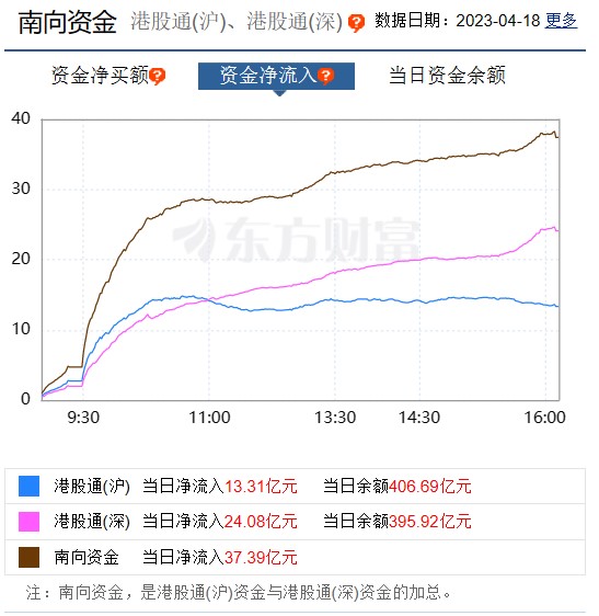 截至4月18日港股收盘,南向资金全日合计净流入逾37.39亿港元。其中,沪市港股通净流入13.31亿港元,深市港股通净流入24.08亿港元。