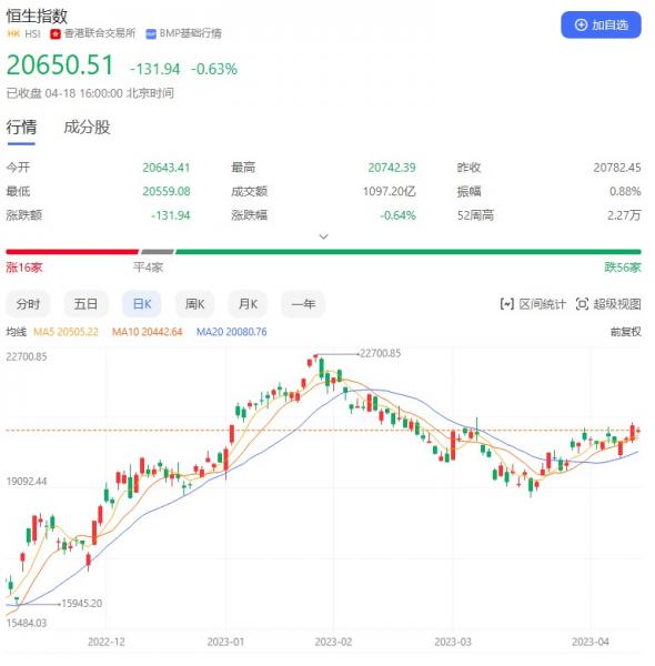 香港恒生指数开盘跌0.67%。早盘震荡走弱,午后一度跌近220点,尾盘跌幅则略微收窄。截至收盘,恒生指数跌0.63%或131.94点,报20650.51点,全日成交额1097.2亿港元;恒生国企指数跌0.75%,报7002.91点;恒生科技指数跌1.21%,报4202.67点。