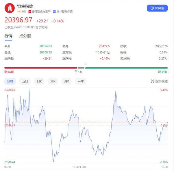 香港恒生指数开盘跌0.06%,全天窄幅震荡。截至收盘,恒生指数涨0.14%或29.21点,报20396.97点,全日成交额1015.61亿港元;恒生国企指数涨0.09%,报6895.29点;恒生科技指数跌0.09%,报4098.35点。