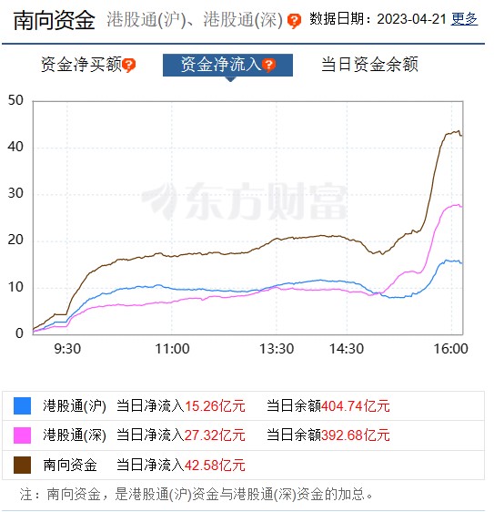 截至4月21日港股收盘,南向资金全日合计净流入逾42.58亿港元。其中,沪市港股通净流入15.26亿港元,深市港股通净流入27.32亿港元。