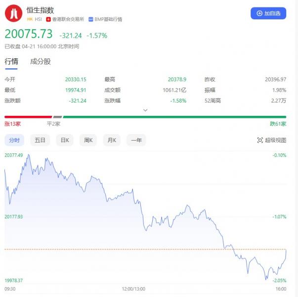 香港恒生指数开盘跌0.33%,全天震荡走低。截至收盘,恒生指数跌1.57%或321.24点,报20075.73点,盘中一度失守二万点关口,全日成交额1061.21亿港元,本周累计跌1.78%;恒生国企指数跌1.9%,报6764.19点;恒生科技指数跌3.13%,报3969.94点。