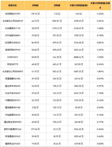 亿胜生物科技(01061)、摩比发展(00947)、东亚银行(00023)、泡泡玛特(09992)、天福(06868)、建滔集团(00148)、新鸿基公司(00086)、中国旺旺(00151)、建业新生活(09983)、新时代能源(00166)、盛业资本(08469)、中裕能源(03633)、太古股份公司A(00019)、太古股份公司B(00087)、乐声电子(00213)、长实集团(01113)、中升控股(00881)、京信通信(02342)、永达汽车(03669)、友邦保险(01299)、同道猎聘(06100)、ESR(01821)、福森药业(01652)、康圣环球(09960)、创胜集团-B(06628)、网龙(00777)于2023年4月25日进行了回购。其中,回购金额最大的为友邦保险(01299),回购数量159.74 万,回购金额1.32 亿元。