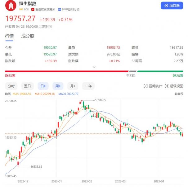 香港恒生指数开盘跌0.49%,早盘震荡上行,午后一度拉升逾285点,尾盘涨幅略有收窄。截至收盘,恒生指数涨0.71%或139.39点,报19757.27点,全日成交额978.88亿港元;恒生国企指数涨0.8%,报6654.4点;恒生科技指数涨1.25%,报3872.01点。
