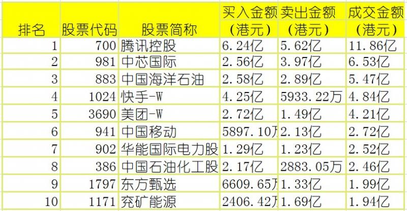 港股通(沪)买卖前十股(单位:港元):
