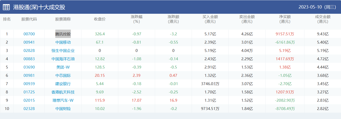 亚汇网5月11日港股通数据统计显示:恒生中国企业净买入额居首,达5.19亿亿港元,腾讯控股净卖出额居第一位。(亚汇网编辑:静香)