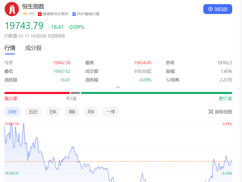 5月11日早盘,港股三大指数集体高开。据Wind数据,恒生指数高开涨幅0.41%,报19842.98点;恒生中国企业指数高开0.70%,报6729.94点;恒生香港中资企业指数高开0.09%,报4141.79点。恒生行业板块开盘多数上涨,非必需性消费、资讯科技、电讯板块涨幅居前。5月10日,港股主要指数收盘表现分化。据Wind数据,香港恒生指数收跌0.53%,报19762.20点;恒生中国企业指数跌0.77%,报6683.23点;恒生科技指数涨0.34%,报3811.66点。行业板块方面,工业、非必需消费板块涨幅居前。