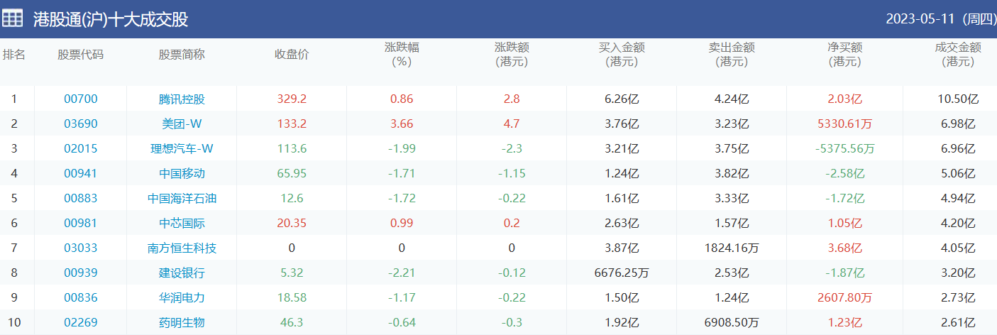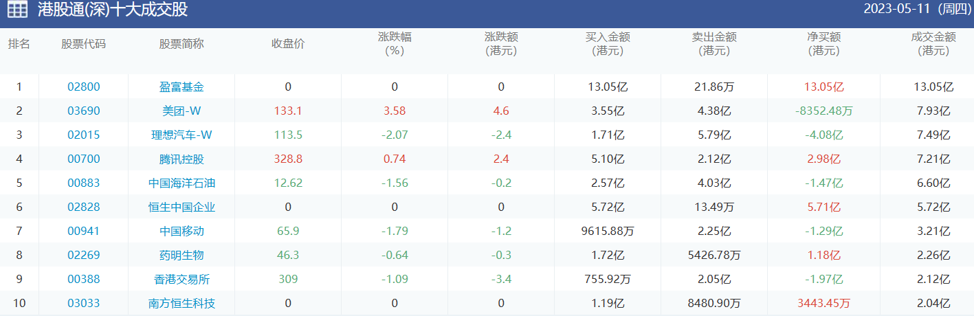 亚汇网实时数据统计:截至5月12日收盘,腾讯控股、美团-W、理想汽车-W位居港股通(沪)成交前三,盈富基金、美团-W、理想汽车-W位居股通(深)成交前三。