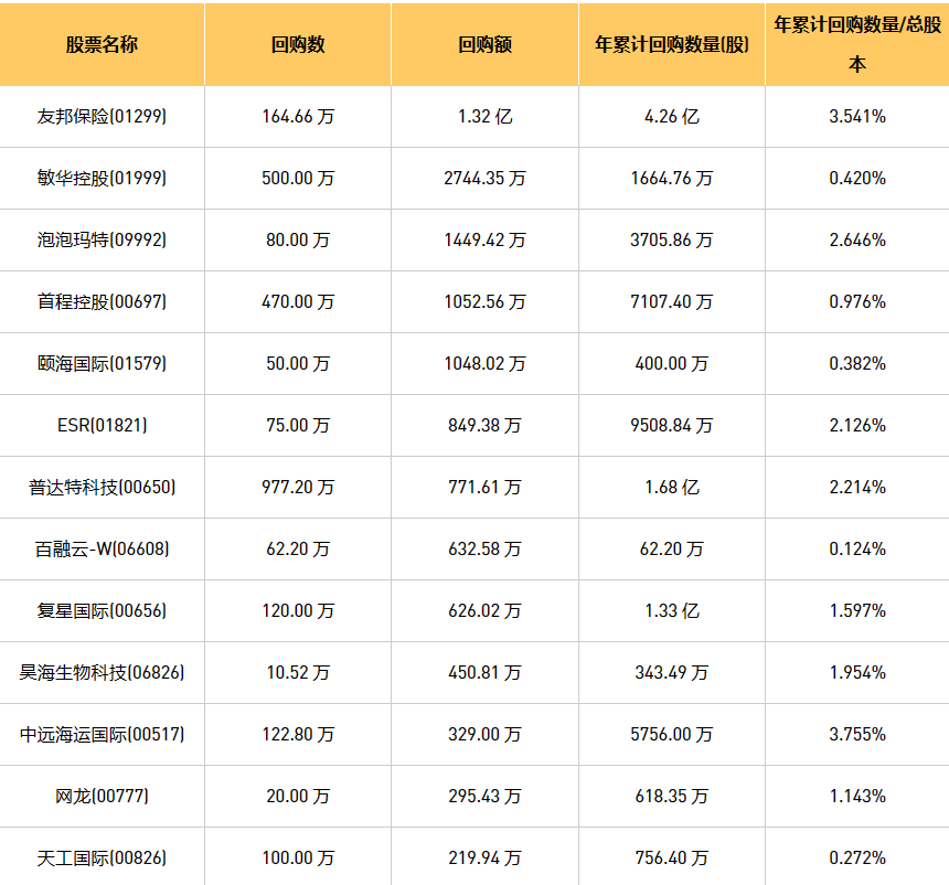 5月18日港股回购概况:和谐汽车(03836)、摩比发展(00947)、昊海生物科技(06826)、亿胜生物科技(01061)、东亚银行(00023)、新时代能源(00166)、京信通信(02342)、首程控股(00697)、盛业资本(08469)、普达特科技(00650)、中裕能源(03633)、泡泡玛特(09992)、百融云-W(06608)、乐声电子(00213)、中远海运国际(00517)、汇量科技(01860)、网龙(00777)、彩客新能源(01986)、颐海国际(01579)、友邦保险(01299)、敏华控股(01999)、ESR(01821)、复星国际(00656)、天工国际(00826)、现代牙科(03600)、康圣环球(09960)于2023年5月17日进行了回购。其中,回购金额最大的为友邦保险(01299),回购数量164.66 万,回购金额1.32 亿元。