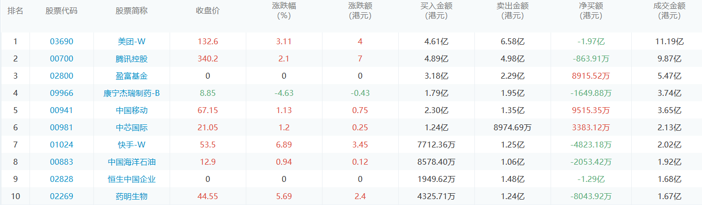 亚汇网5月22日港股通数据统计显示:腾讯控股净买入额居首,达4.89亿港元,美团-w净卖出额居第一位。(亚汇网编辑:静香)