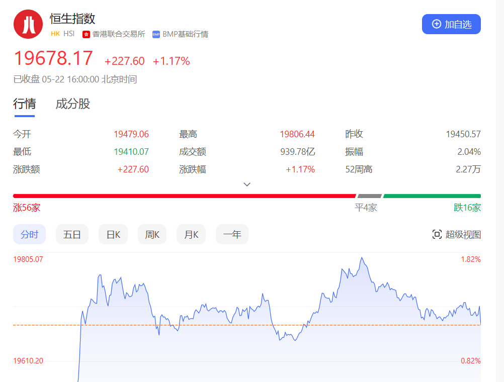 香港恒生指数开盘涨0.15%,早盘恒指小幅下跌后迅速翻红上涨,此后全天呈高位震荡走势,尾盘涨幅则有所收窄。截至收盘,恒生指数涨1.17%或227.6点,报19678.17点,全日成交额939.78亿港元;恒生国企指数涨1.51%,报6693.64点;恒生科技指数涨2.14%,报3903.58点。