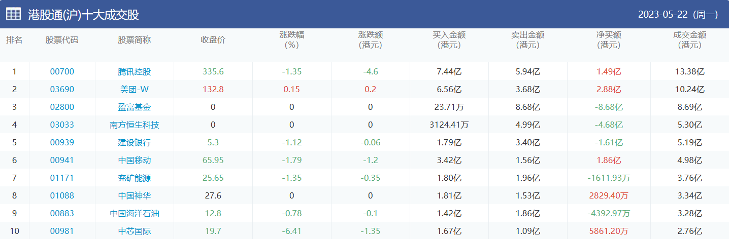 亚汇网实时数据统计:截至5月23日收盘,盈富基金、腾讯控股、恒生中国企业位居港股通(沪)成交前三,美团-w、腾讯控股、盈富基金位居股通(深)成交前三。