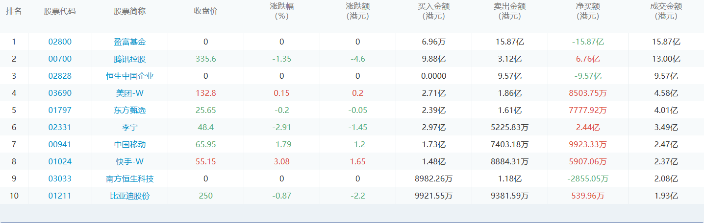 亚汇网5月23日港股通数据统计显示:腾讯控股净买入额居首,达9.88亿港元,盈富基金净卖出额居第一位。(亚汇网编辑:静香)