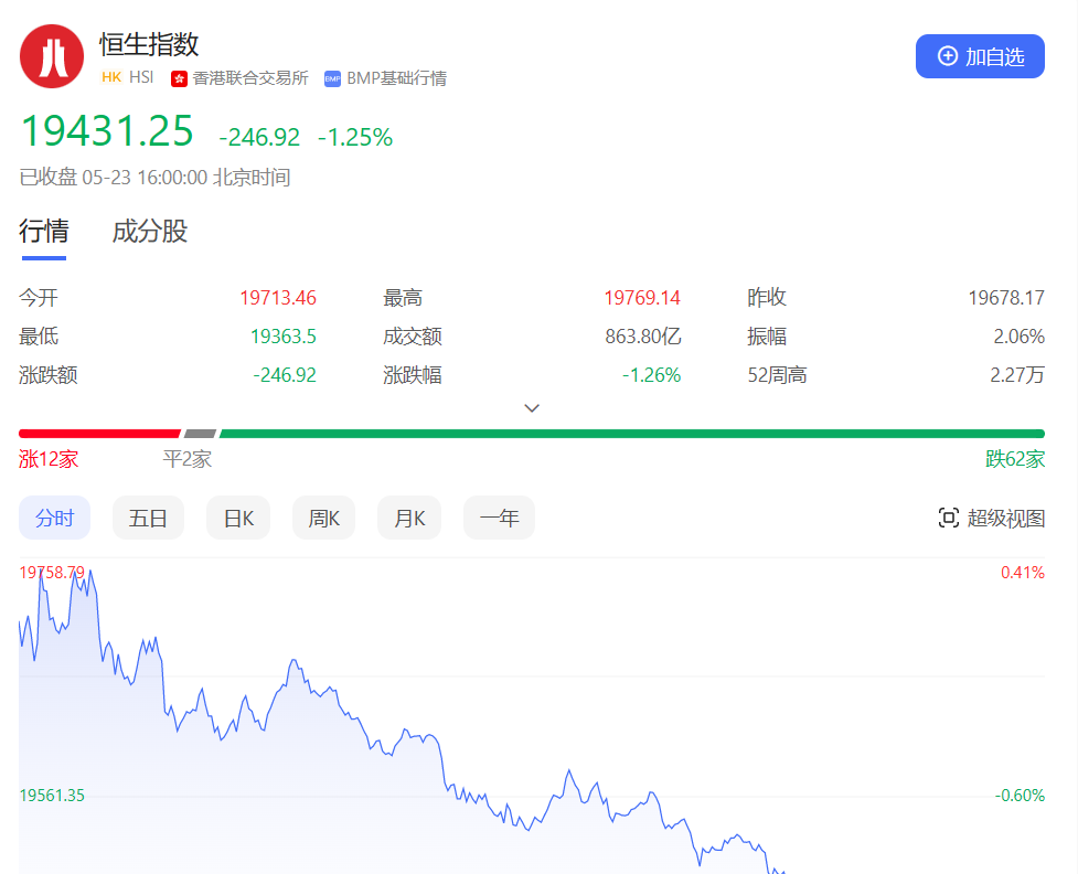 香港恒生指数开盘涨0.18%,全天呈震荡走弱态势。截至收盘,恒生指数跌1.25%或246.92点,报19431.25点,全日成交额863.8亿港元;恒生国企指数跌1.35%,报6603.57点;恒生科技指数跌1.31%,报3852.45点。