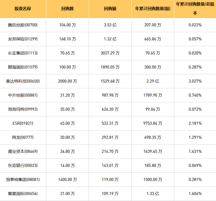 5月24日港股回购概况:普达特科技(00650)、恒泰裕集团(08081)、亿胜生物科技(01061)、新时代能源(00166)、亚洲金融(00662)、天福(06868)、泡泡玛特(09992)、网龙(00777)、清科创业(01945)、东亚银行(00023)、腾讯控股(00700)、乐声电子(00213)、友邦保险(01299)、盛业资本(08469)、复星国际(00656)、长实集团(01113)、中远海运国际(00517)、摩比发展(00947)、汇量科技(01860)、创胜集团-B(06628)、中升控股(00881)、康圣环球(09960)、颐海国际(01579)、ESR(01821)于2023年5月23日进行了回购。其中,回购金额最大的为腾讯控股(00700),回购数量104.00 万,回购金额3.53 亿元。