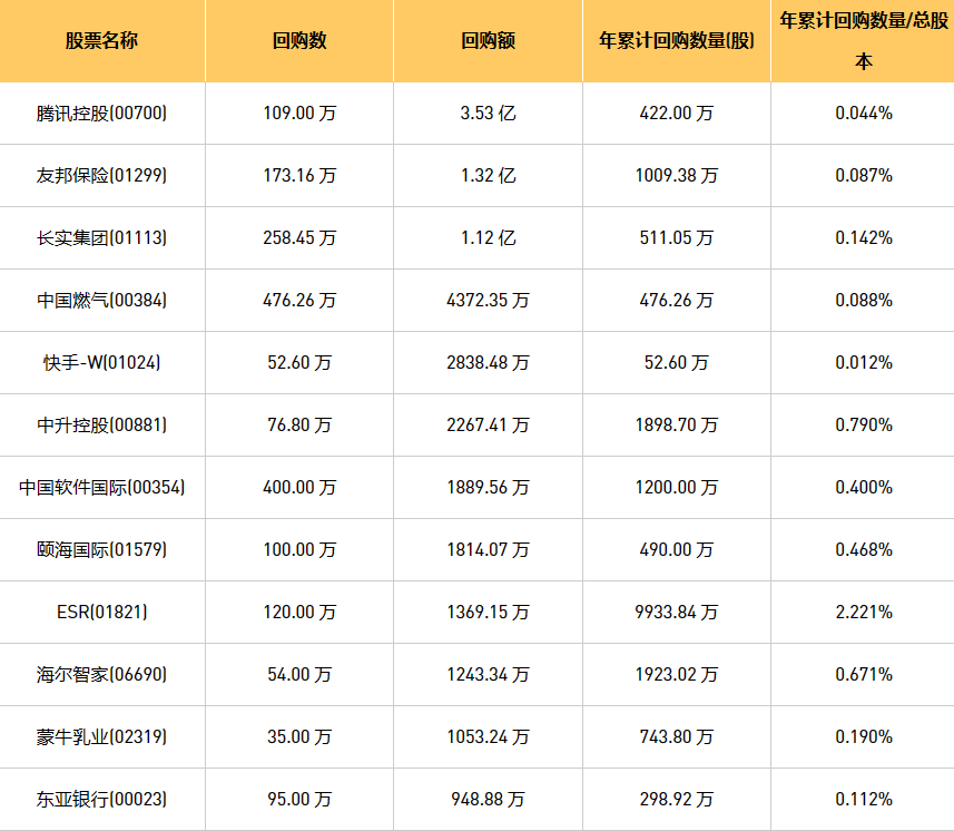 5月26日港股回购概况:和谐汽车(03836)、恒泰裕集团(08081)、亿胜生物科技(01061)、摩比发展(00947)、东亚银行(00023)、泡泡玛特(09992)、新鸿基公司(00086)、百富环球(00327)、汇量科技(01860)、中国燃气(00384)、友邦保险(01299)、中国心连心化肥(01866)、彩客新能源(01986)、百宏实业(02299)、普达特科技(00650)、中国软件国际(00354)、网龙(00777)、中远海运国际(00517)、长实集团(01113)、新时代能源(00166)、复星国际(00656)、蒙牛乳业(02319)、乐声电子(00213)、颐海国际(01579)、中升控股(00881)、康圣环球(09960)、永达汽车(03669)、海尔智家(06690)、腾讯控股(00700)、ESR(01821)、创胜集团-B(06628)、福森药业(01652)、快手-W(01024)于2023年5月25日进行了回购。其中,回购金额最大的为腾讯控股(00700),回购数量109.00 万,回购金额3.53 亿元。