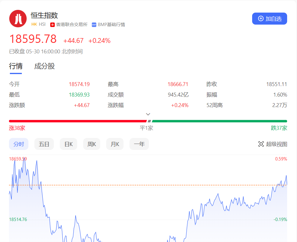 香港恒生指数开盘涨0.12%,早盘恒指高开下探,午后震荡回升,整体呈“V”字走势。截至收盘,恒生指数涨0.24%或44.67点,报18595.78点,全日成交额945.42亿港元;恒生国企指数涨0.52%,报6283.71点;恒生科技指数涨1.5%,报3702.13点。