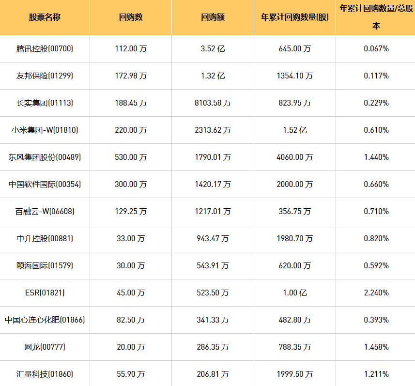 5月31日港股回购概况:亿胜生物科技(01061)、摩比发展(00947)、天福(06868)、东亚银行(00023)、和谐汽车(03836)、腾讯控股(00700)、建业新生活(09983)、百融云-W(06608)、新鸿基公司(00086)、中国软件国际(00354)、中国心连心化肥(01866)、汇量科技(01860)、东风集团股份(00489)、复星国际(00656)、彩客新能源(01986)、长实集团(01113)、中远海运国际(00517)、颐海国际(01579)、网龙(00777)、友邦保险(01299)、小米集团-W(01810)、ESR(01821)、中升控股(00881)、同道猎聘(06100)、康圣环球(09960)、创胜集团-B(06628)于2023年5月30日进行了回购。其中,回购金额最大的为腾讯控股(00700),回购数量112.00 万,回购金额3.52 亿元。