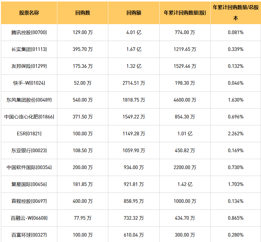 6月1日港股回购概况:中国软件国际(00354)、和谐汽车(03836)、首程控股(00697)、东亚银行(00023)、汇量科技(01860)、天福(06868)、复星国际(00656)、中国心连心化肥(01866)、百富环球(00327)、百融云-W(06608)、新鸿基公司(00086)、腾讯控股(00700)、恒泰裕集团(08081)、东风集团股份(00489)、永达汽车(03669)、友邦保险(01299)、同道猎聘(06100)、创胜集团-B(06628)、长实集团(01113)、明源云(00909)、网龙(00777)、快手-W(01024)、建业新生活(09983)、ESR(01821)、康圣环球(09960)、福森药业(01652)、圣诺医药-B(02257)于2023年5月31日进行了回购。其中,回购金额最大的为腾讯控股(00700),回购数量129.00 万,回购金额4.01 亿元。