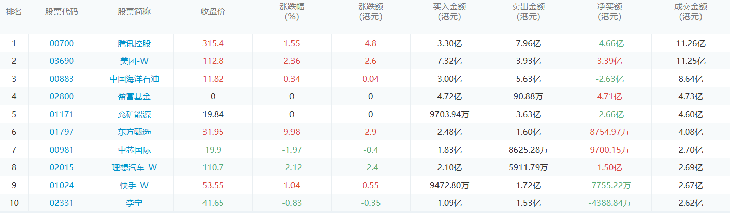 亚汇网6月1日港股通数据统计显示:美团-w净买入额居首,达7.32亿港元,腾讯控股净卖出额居第一位。(亚汇网编辑:静香)