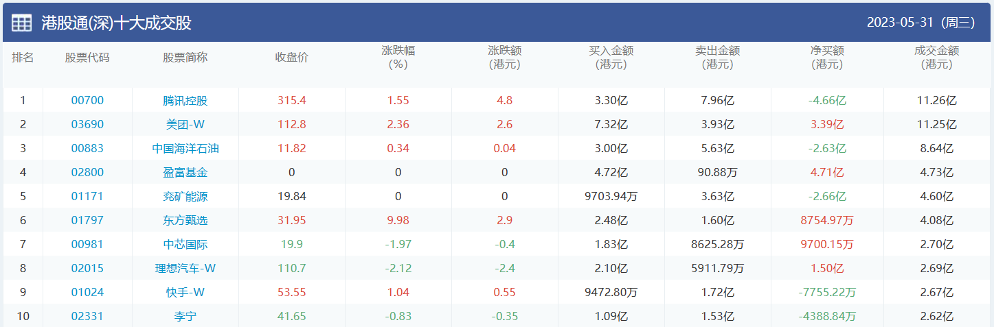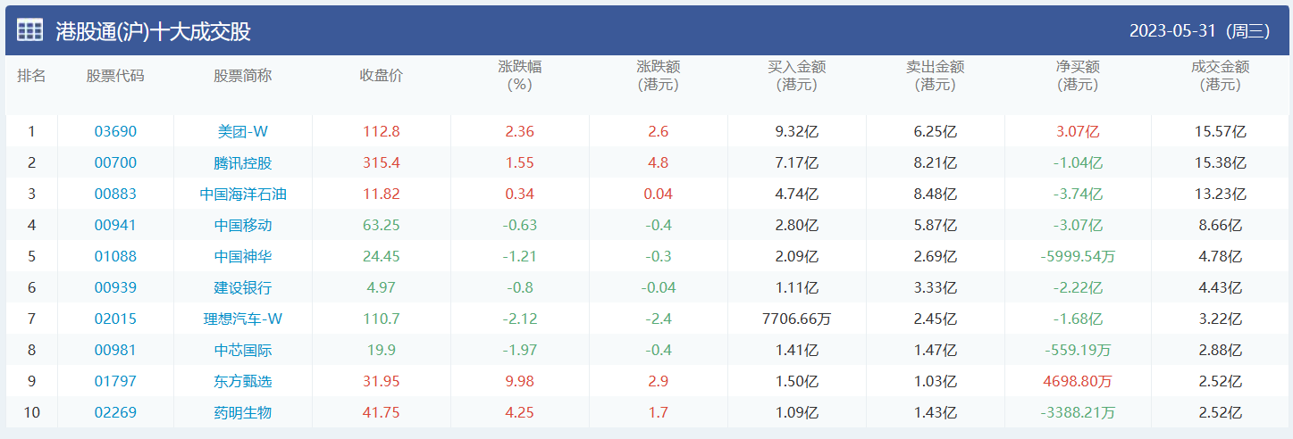 亚汇网实时数据统计:截至5月31日收盘,美团-w、腾讯控股、中国海洋石油位居港股通(沪)成交前三,腾讯控股、美团-w、中国海洋石油位居股通(深)成交前三。