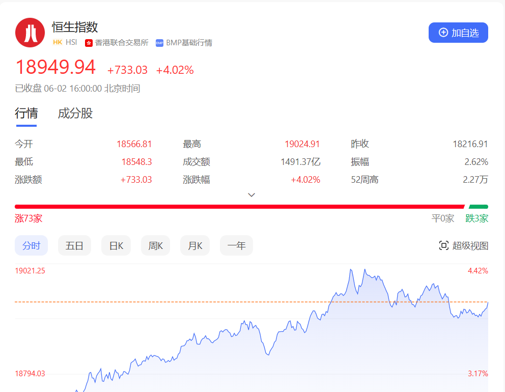 香港恒生指数开盘涨1.92%,早盘恒指大幅高开,呈单边上行走势,午后继续冲高,盘中一度收复1万9大关,尾盘涨幅略微收窄。截至收盘,恒生指数涨4.02%或733.03点,报18949.94点,本周累涨1.08%,全日成交额1491.37亿港元;恒生国企指数涨4.53%,报6428.33点;恒生科技指数涨5.33%,报3824.28点。