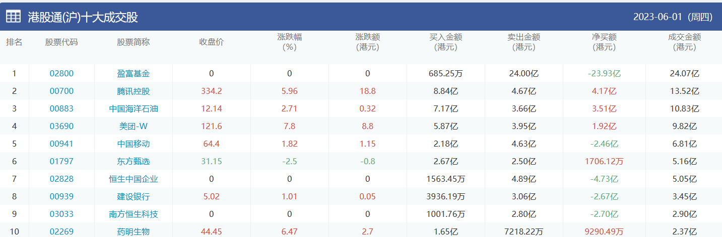 亚汇网实时数据统计:截至6月5日收盘,盈富基金、腾讯控股、中国海洋石油位居港股通(沪)成交前三,盈富基金、腾讯控股、中国海洋石油位居股通(深)成交前三。
