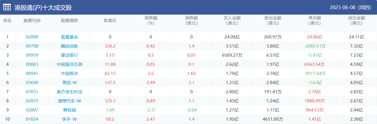 亚汇网实时数据统计:截至6月9日收盘,盈富基金、腾讯控股、建设银行位居港股通(沪)成交前三,腾讯控股、盈富基金、美团-w位居股通(深)成交前三。