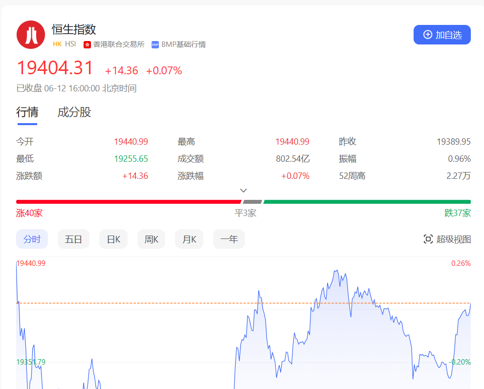 香港恒生指数开盘涨0.26%,早盘恒指高开后迅速下挫,一度跌近130点。午后拉升转涨,此后呈窄幅震荡态势。截至收盘,恒生指数涨0.07%或14.36点,报19404.31点,全日成交额802.54亿港元;恒生国企指数跌0.06%,报6585.68点;恒生科技指数涨0.27%,报3944.67点。