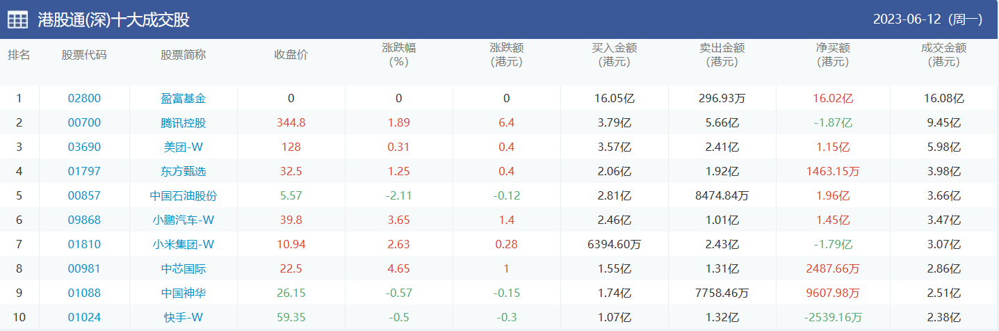 亚汇网实时数据统计:截至6月13日收盘,盈富基金、腾讯控股、恒生中国企业位居港股通(沪)成交前三,盈富基金、腾讯控股、美团-w位居股通(深)成交前三。