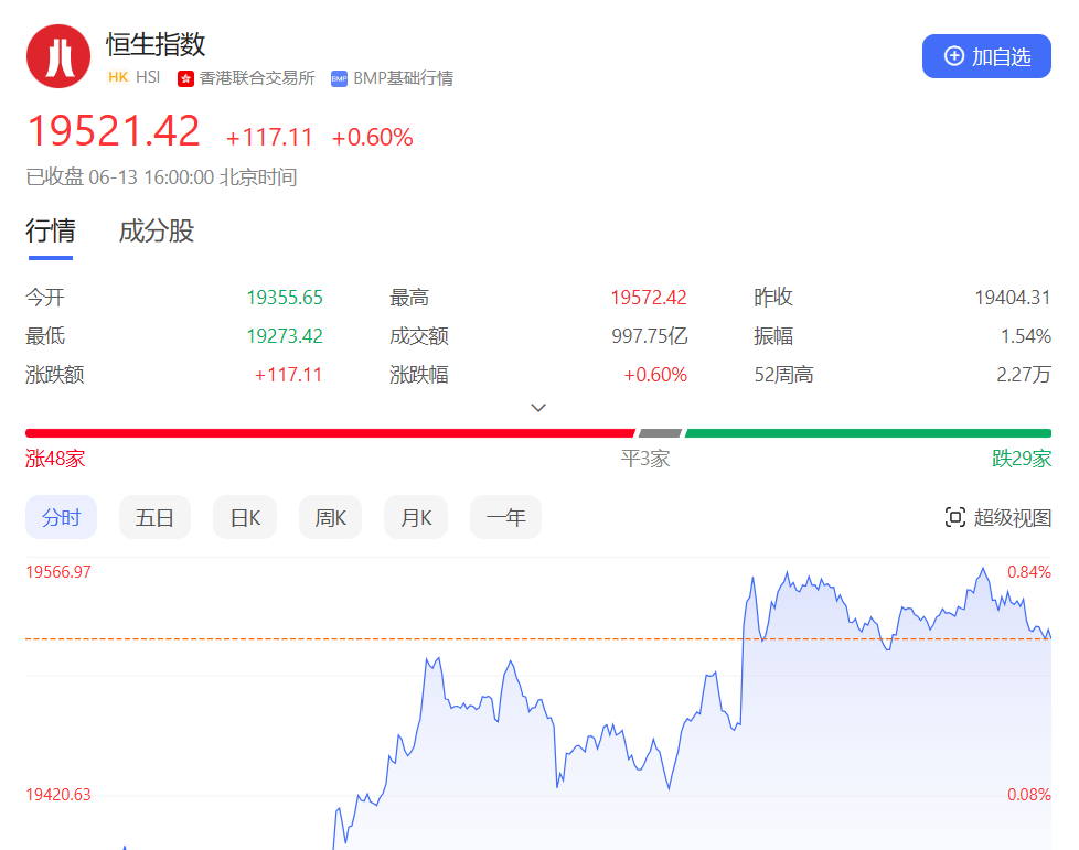 香港恒生指数开盘跌0.25%,早盘恒指低开后震荡走高,午后一度涨近160点,尾盘涨幅有所收窄。截至收盘,恒生指数涨0.6%或117.11点,报19521.42点,全日成交额997.75亿港元;恒生国企指数涨0.5%,报6618.29点;恒生科技指数涨2.37%,报4038.2点。