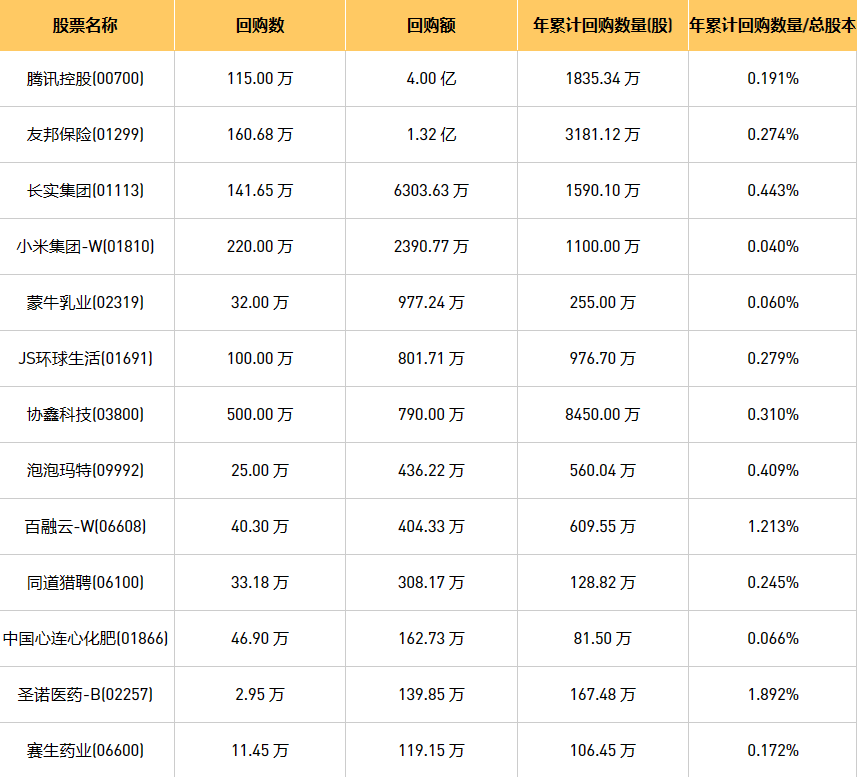 6月15日港股回购概况:朗生医药(00503)、摩比发展(00947)、天福(06868)、蒙牛乳业(02319)、东亚银行(00023)、友邦保险(01299)、泡泡玛特(09992)、京信通信(02342)、腾讯控股(00700)、新时代能源(00166)、汇量科技(01860)、百融云-W(06608)、中远海运国际(00517)、创胜集团-B(06628)、同道猎聘(06100)、小米集团-W(01810)、中国心连心化肥(01866)、长实集团(01113)、易大宗(01733)、现代牙科(03600)、旭日企业(00393)、圣诺医药-B(02257)、金科服务(09666)、赛生药业(06600)、JS环球生活(01691)、协鑫科技(03800)、康圣环球(09960)于2023年6月14日进行了回购。其中,回购金额最大的为腾讯控股(00700),回购数量115.00 万,回购金额4.00 亿元。