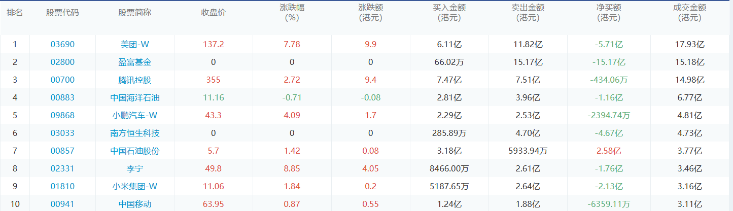 亚汇网6月15日港股通数据统计显示:腾讯控股净买入额居首,达7.47亿港元,盈富基金净卖出额居第一位。(亚汇网编辑:静香)
