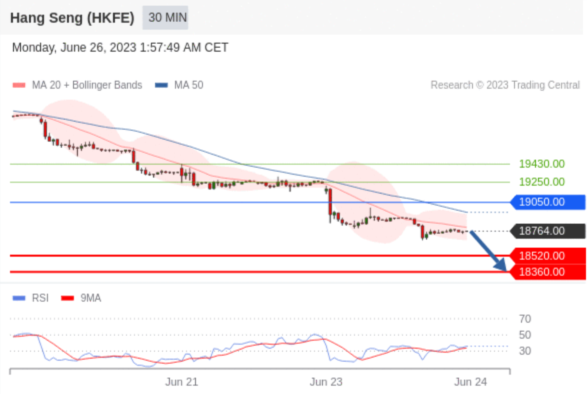 交易策略: 在 19050.00 之下,看跌,目标价位为 18520.00 ,然后为 18360.00 。