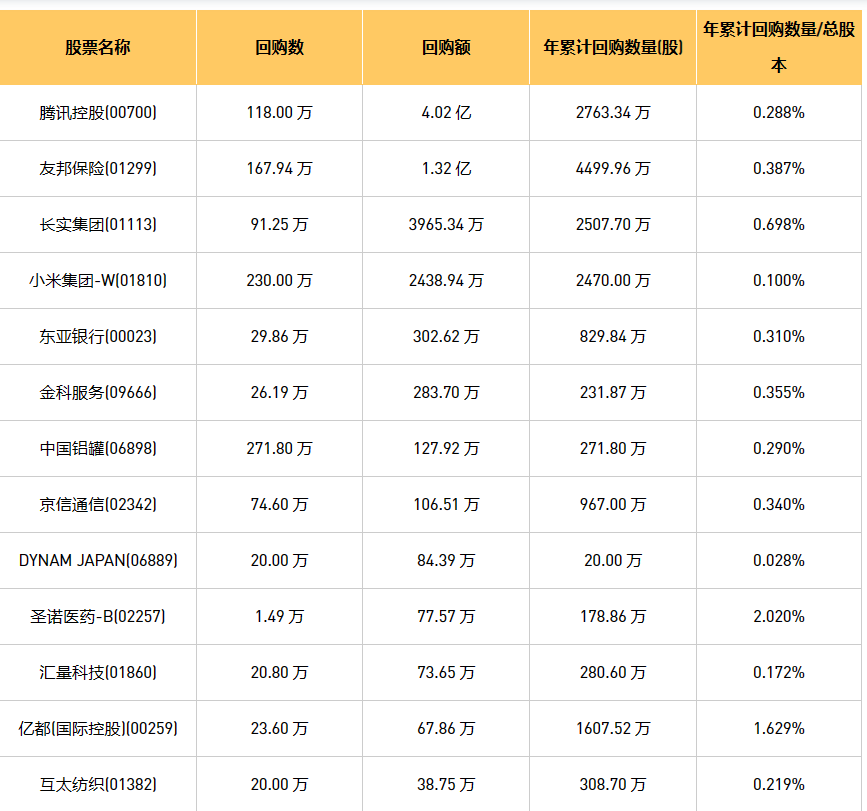 6月28日港股回购概况:朗生医药(00503)、永安国际(00289)、天福(06868)、摩比发展(00947)、新时代能源(00166)、东亚银行(00023)、清科创业(01945)、DYNAM JAPAN(06889)、互太纺织(01382)、京信通信(02342)、友邦保险(01299)、兴胜创建(00896)、亿都(国际控股)(00259)、金科服务(09666)、腾讯控股(00700)、歌礼制药-B(01672)、小米集团-W(01810)、汇量科技(01860)、中远海运国际(00517)、圣诺医药-B(02257)、美亨实业(01897)、易大宗(01733)、长实集团(01113)、中国铝罐(06898)、康圣环球(09960)、ESR(01821)于2023年6月27日进行了回购。其中,回购金额最大的为腾讯控股(00700),回购数量118.00 万,回购金额4.02 亿元。