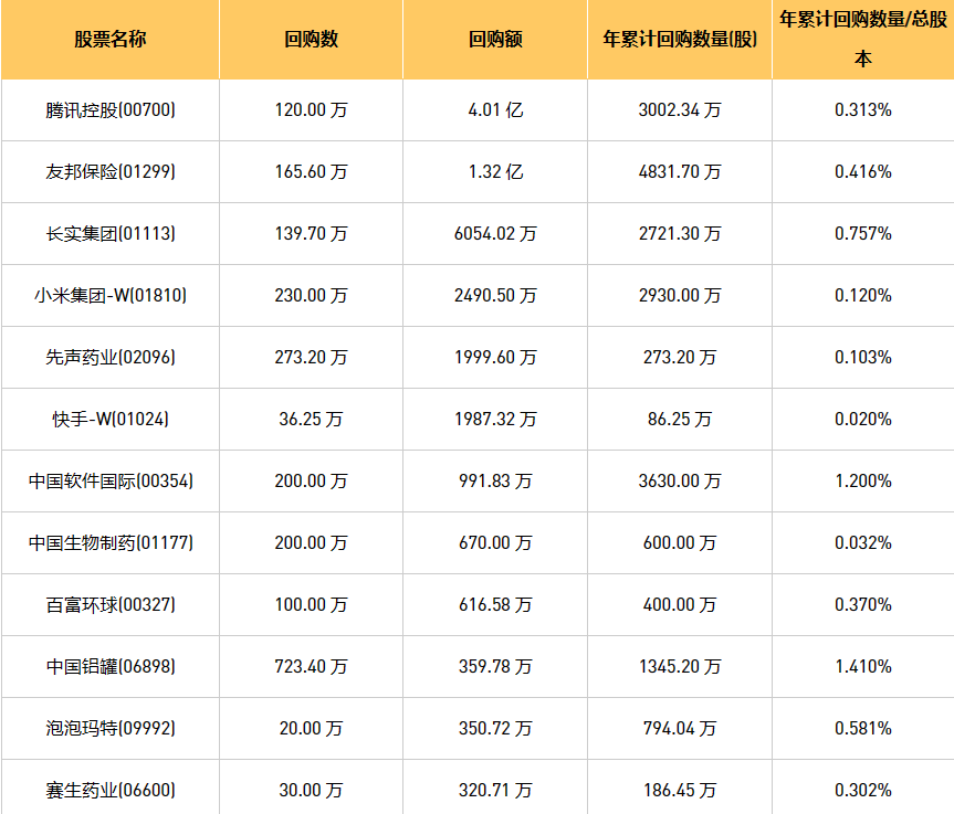 6月30日港股回购概况:朗生医药(00503)、中国生物制药(01177)、伟仕佳杰(00856)、摩比发展(00947)、天福(06868)、DYNAM JAPAN(06889)、泡泡玛特(09992)、互太纺织(01382)、新百利融资(08439)、中国软件国际(00354)、东亚银行(00023)、京信通信(02342)、新时代能源(00166)、腾讯控股(00700)、兴胜创建(00896)、亿都(国际控股)(00259)、易大宗(01733)、百富环球(00327)、金科服务(09666)、盛业资本(08469)、中国铝罐(06898)、复星国际(00656)、长实集团(01113)、现代牙科(03600)、乐声电子(00213)、汇量科技(01860)、友邦保险(01299)、小米集团-W(01810)、圣诺医药-B(02257)、同道猎聘(06100)、赛生药业(06600)、福森药业(01652)、快手-W(01024)、康圣环球(09960)、先声药业(02096)、永达汽车(03669)于2023年6月29日进行了回购。其中,回购金额最大的为腾讯控股(00700),回购数量120.00 万,回购金额4.01 亿元。