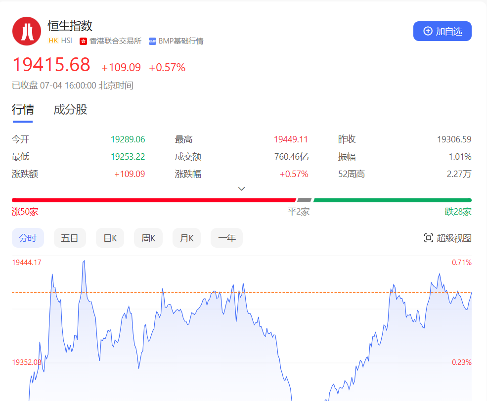 香港恒生指数开盘跌0.09%,早盘恒指低开后迅速走高,随后呈窄幅震荡走势,午后则呈现“V”型走势。截止收盘,恒生指数涨0.57%或109.09点,报19415.68点,全日成交额760.46亿港元;恒生国企指数涨0.34%,报6613.4点;恒生科技指数涨0.5%,报4074.42点。