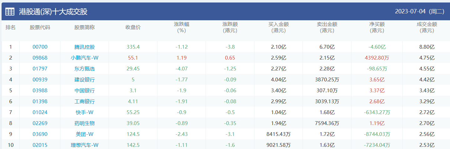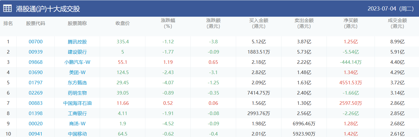 亚汇网实时数据统计:截至7月5日收盘,腾讯控股、建设银行、小鹏汽车-w位居港股通(沪)成交前三,腾讯控股、小鹏汽车-w、东方甄选位居股通(深)成交前三。