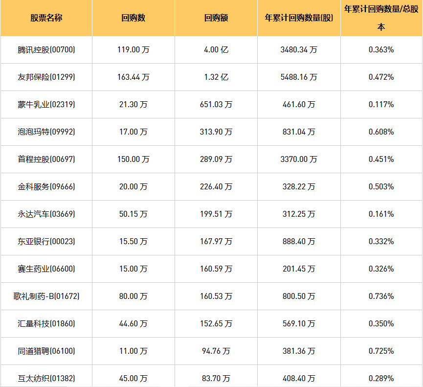 7月6日港股回购概况:亿胜生物科技(01061)、摩比发展(00947)、蒙牛乳业(02319)、天福(06868)、互太纺织(01382)、东亚银行(00023)、首程控股(00697)、友邦保险(01299)、民银资本(01141)、歌礼制药-B(01672)、腾讯控股(00700)、京信通信(02342)、清科创业(01945)、德祥地产(00199)、泡泡玛特(09992)、中国铝罐(06898)、亿都(国际控股)(00259)、兴胜创建(00896)、同道猎聘(06100)、金科服务(09666)、彩客新能源(01986)、汇量科技(01860)、旭日企业(00393)、现代牙科(03600)、盛业资本(08469)、易大宗(01733)、赛生药业(06600)、康圣环球(09960)、永达汽车(03669)、ESR(01821)、圣诺医药-B(02257)于2023年7月5日进行了回购。其中,回购金额最大的为腾讯控股(00700),回购数量119.00 万,回购金额4.00 亿元。