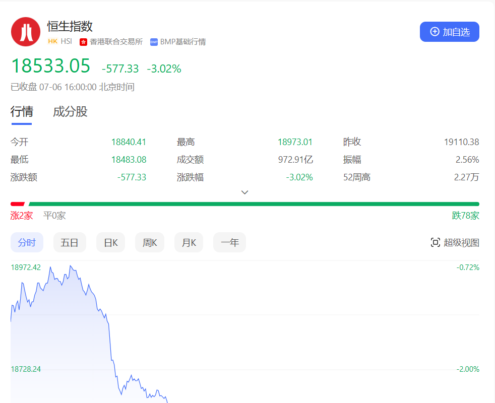 香港恒生指数开盘跌1.41%,早盘恒指低开后小幅上升,随后上涨乏力并加速下跌,盘中一度跌超620点,恒指创逾1个月来新低。截止收盘,恒生指数跌3.02%或577.33点,报18533.05点,全日成交额972.91亿港元;恒生国企指数跌3.41%,报6268.53点;恒生科技指数跌1.69%,报3948.82点。