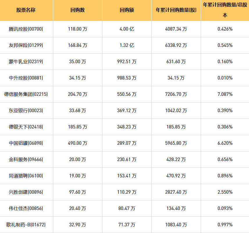 7月13日港股回购概况:天福(06868)、摩比发展(00947)、伟仕佳杰(00856)、朗生医药(00503)、互太纺织(01382)、东亚银行(00023)、德祥地产(00199)、蒙牛乳业(02319)、京信通信(02342)、腾讯控股(00700)、歌礼制药-B(01672)、中国铝罐(06898)、兴胜创建(00896)、亿都(国际控股)(00259)、彩客新能源(01986)、同道猎聘(06100)、德银天下(02418)、时代天使(06699)、金科服务(09666)、友邦保险(01299)、圣诺医药-B(02257)、汇量科技(01860)、中升控股(00881)、ESR(01821)、德信服务集团(02215)、康圣环球(09960)于2023年7月12日进行了回购。其中,回购金额最大的为腾讯控股(00700),回购数量118.00 万,回购金额4.00 亿元。