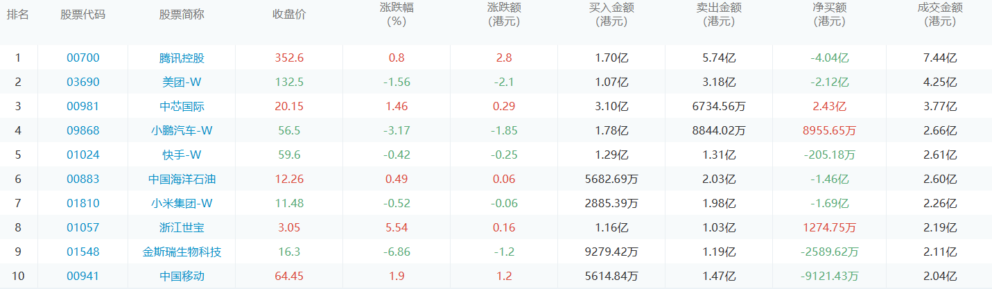 亚汇网7月14日港股通数据统计显示:中芯国际净买入额居首,达3.10亿港元,腾讯控股净卖出额居第一位。(亚汇网编辑:静香)