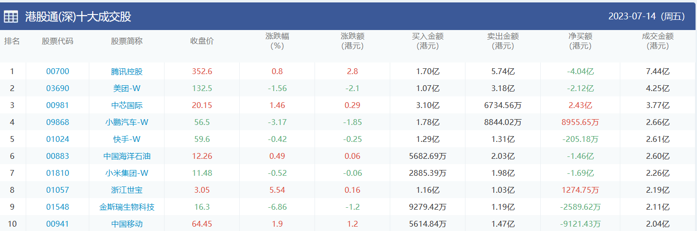 亚汇网实时数据统计:截至7月14日收盘,腾讯控股、美团-w、中芯国际位居港股通(沪)成交前三,腾讯控股、美团-w、中芯国际位居股通(深)成交前三。