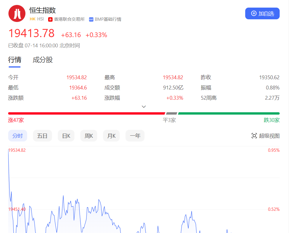 香港恒生指数开盘涨0.95%,早盘恒指高开后迅速走低,此后全天呈窄幅震荡走势。截止收盘,恒生指数涨0.33%或63.16点,报19413.78点,本周累涨5.71%,全日成交额912.5亿港元;恒生国企指数涨0.23%,报6558.88点;恒生科技指数跌0.2%,报4228.71点。